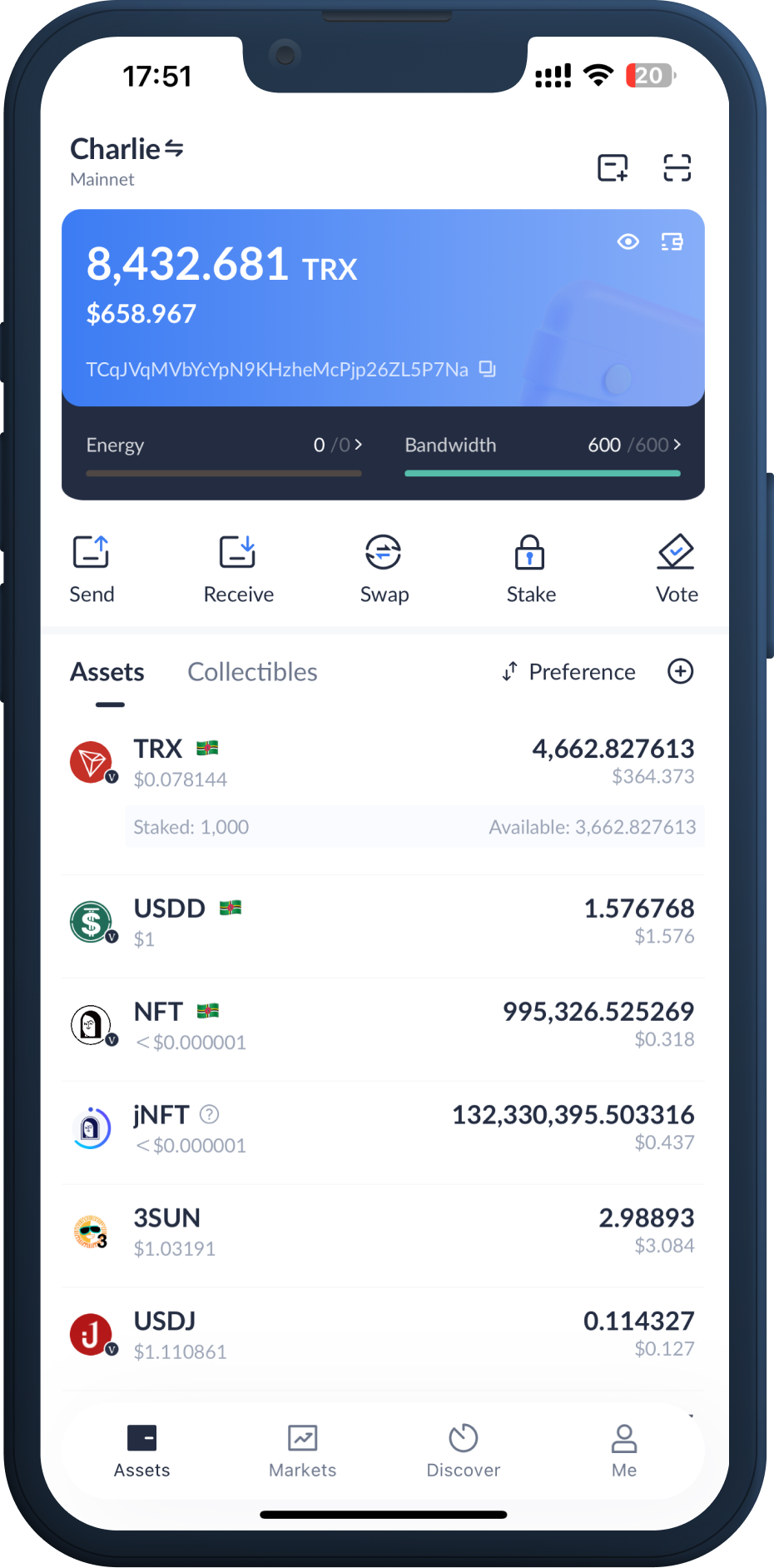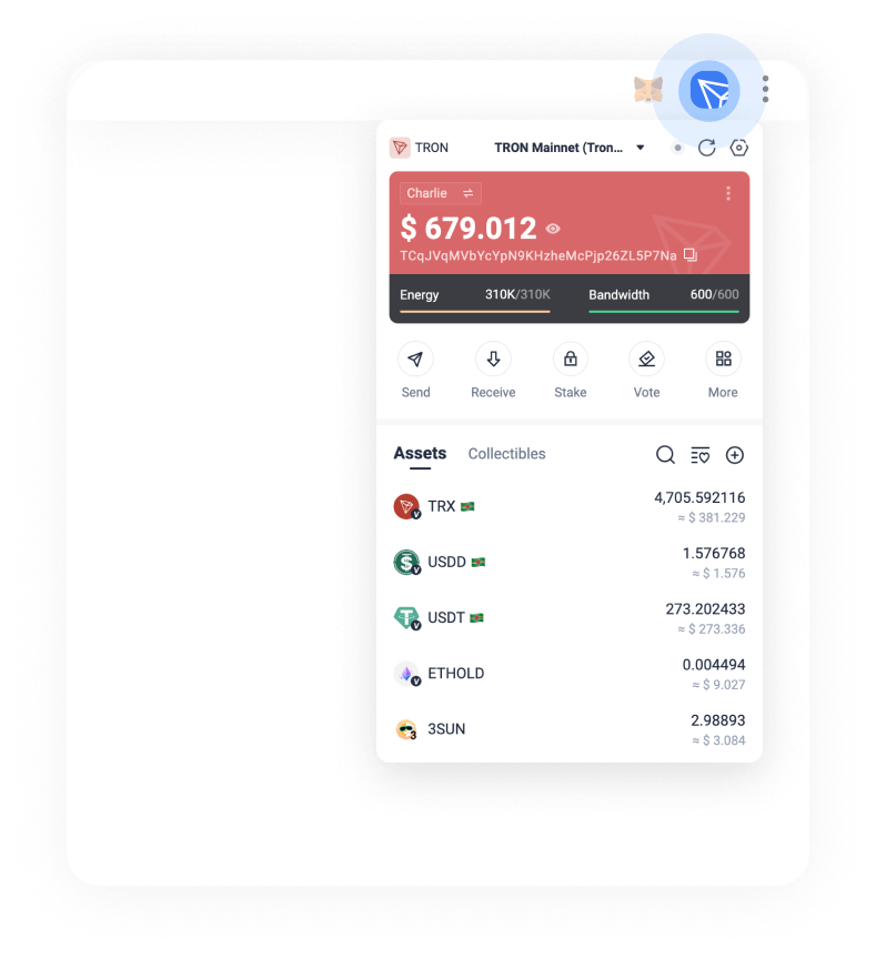 深度支持 TRON 网络,兼容 TRX、TRC10、TRC20、TRC721 等币种,并支持质押获取资源及代理资源机制.